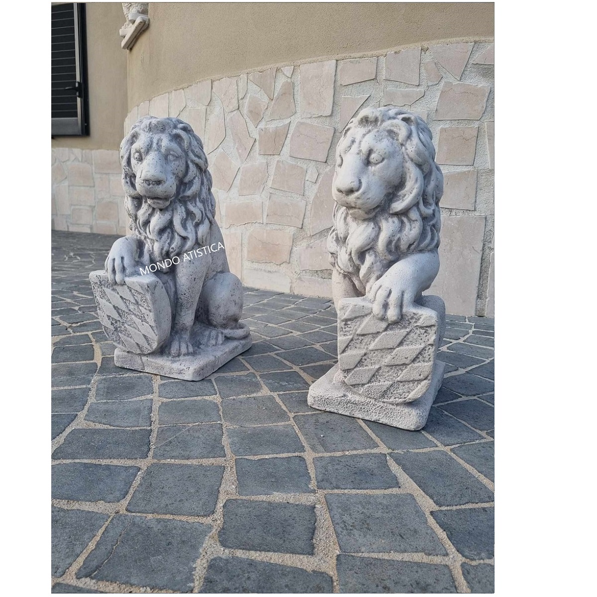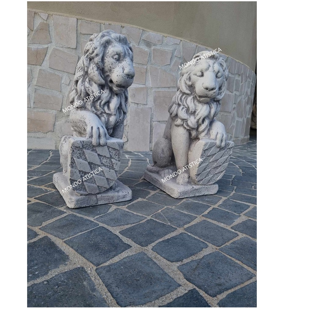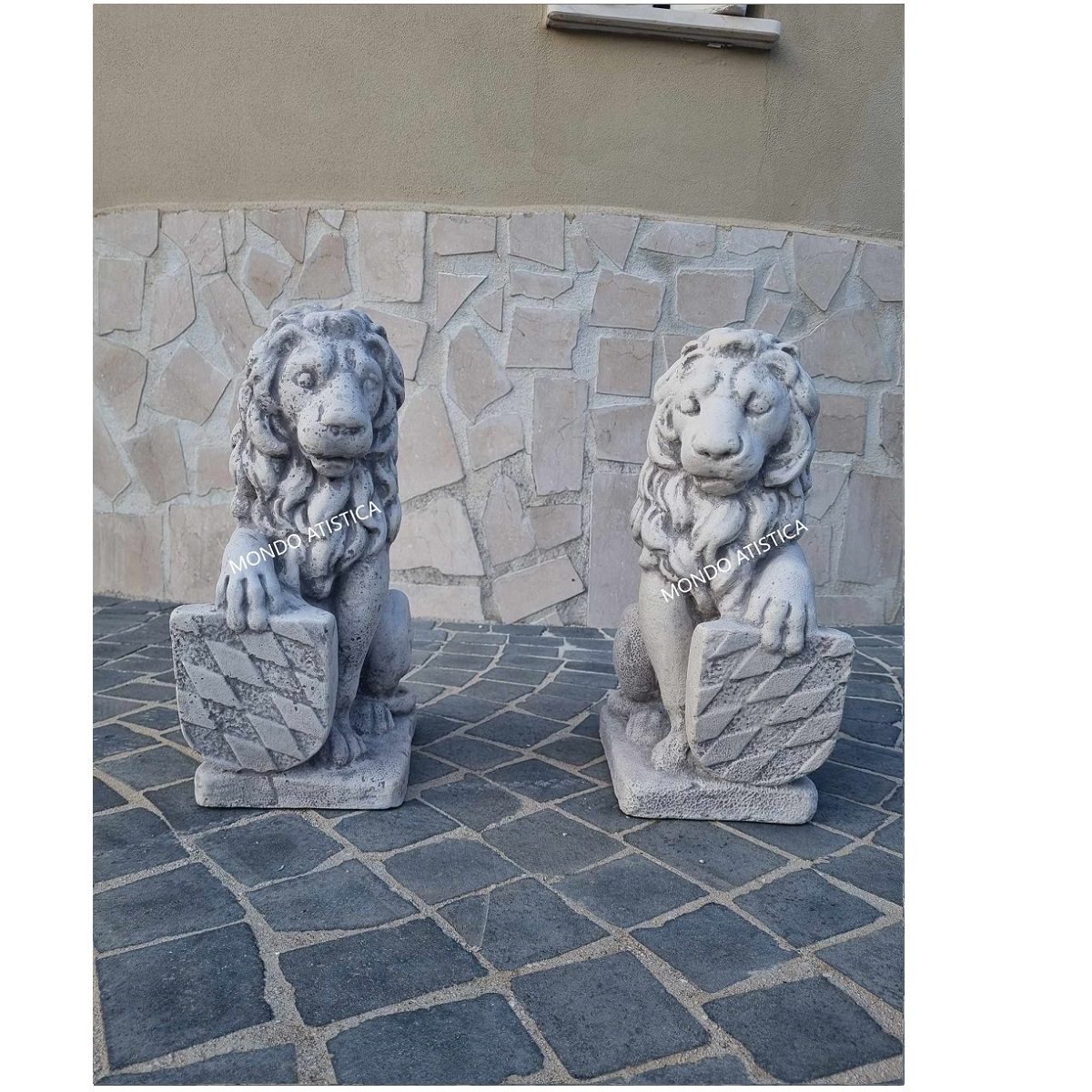 Coppia di leoni con stemma rombo altezza 40 cm.