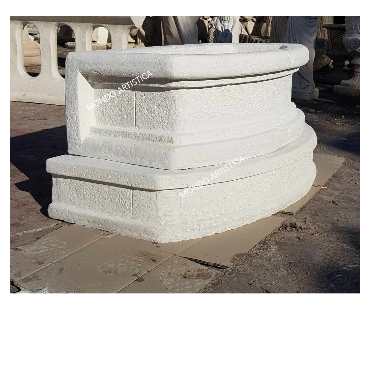 La gamma degli articoli prodotti è vasta: vasi, statue, fontane, lavandini, colonne, capitelli, balaustre ed ancora bassorilievi, busti, bordi per piscina, cornici personalizzate ed altro ancora. Mondo Artistica si distingue per la qualità di tutta la propria produzione, i nostri prodotti hanno un’ ineguagliabile compattezza e resistenza a qualsiasi fenomeno atmosferico. Abbiamo aperto il nostro e-commerce per espanderci in tutta Italia e in tutto il Mondo. Possiamo spedire i nostri prodotti in ogni parte d’ Italia, grazie ad un particolare imballaggio su pallet che ne salvaguarda l’integrità durante il trasporto. Con soddisfazione affermiamo che i nostri prodotti sono manufatti artigianali tipicamente italiani che i nostri clienti apprezzano per la loro qualità.